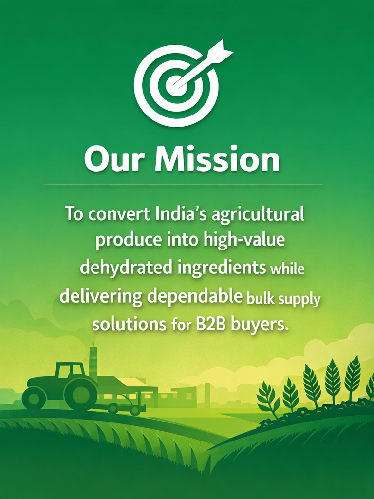 To convert India’s agricultural produce into high-value dehydrated ingredients while delivering dependable bulk supply solutions for B2B buyers.