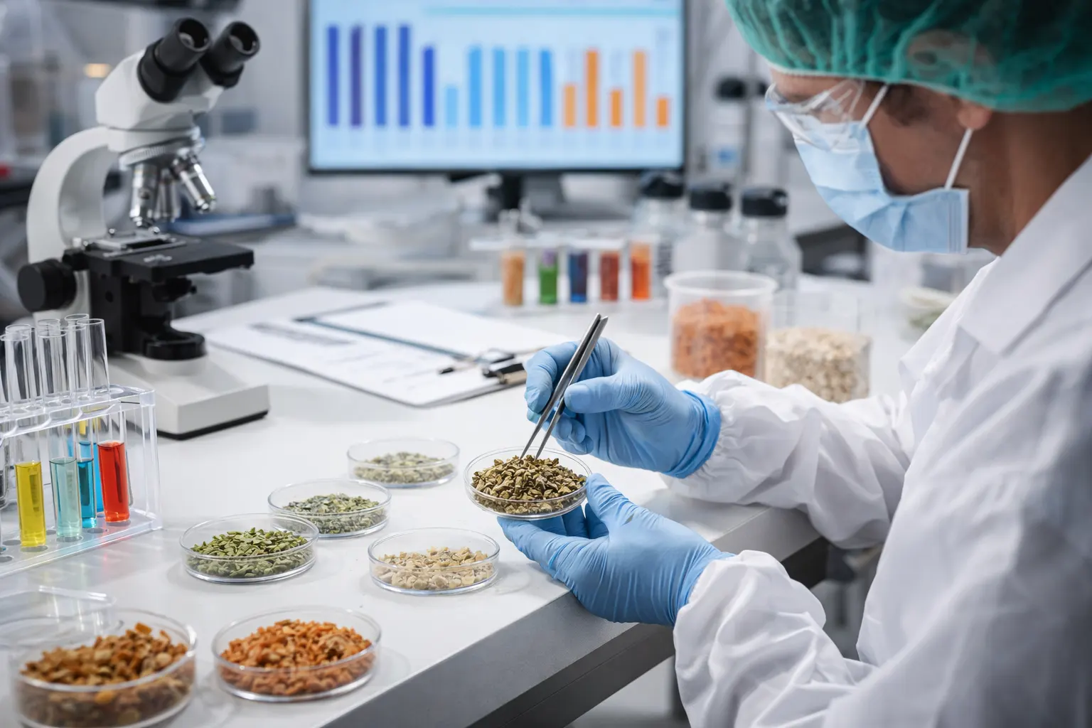 Routine laboratory analysis is conducted to test for contaminants, pesticide residues, and microbial safety to maintain superior product standards.
