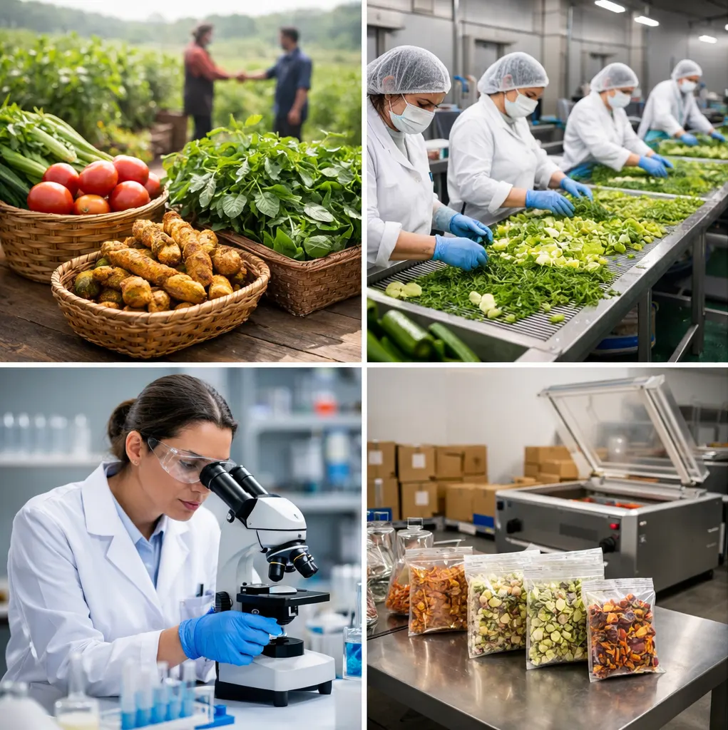 Products are thoroughly cleaned, sorted, and prepared using food-grade equipment under hygienic conditions.